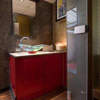 Manchmal muss es nicht nur bestens sein, sondern ausgesprochen EXKLUSIV – unser Toilettenwagen de luxe mit hochwertigen Extras. Das Ambiente: Eine Design-Komposition aus tiefem Rot, dunklem Blau, Gold und Anthrazit sowie Nußbaum. Die markanten Glasbecken an den Waschtischen wurden eigens für EXKLUSIV entworfen. Und der noble Holzboden vollendet den Gesamteindruck. EXKLUSIV ist automatisch vollklimatisiert und bietet serienmäßig angenehme Stoffhandtücher.